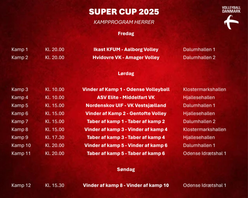 Der er kampe både fredag, lørdag og søndag, og alle hold er blevet seedet ud fra deres endelige placering i Volleyligaen fra sidste sæson.